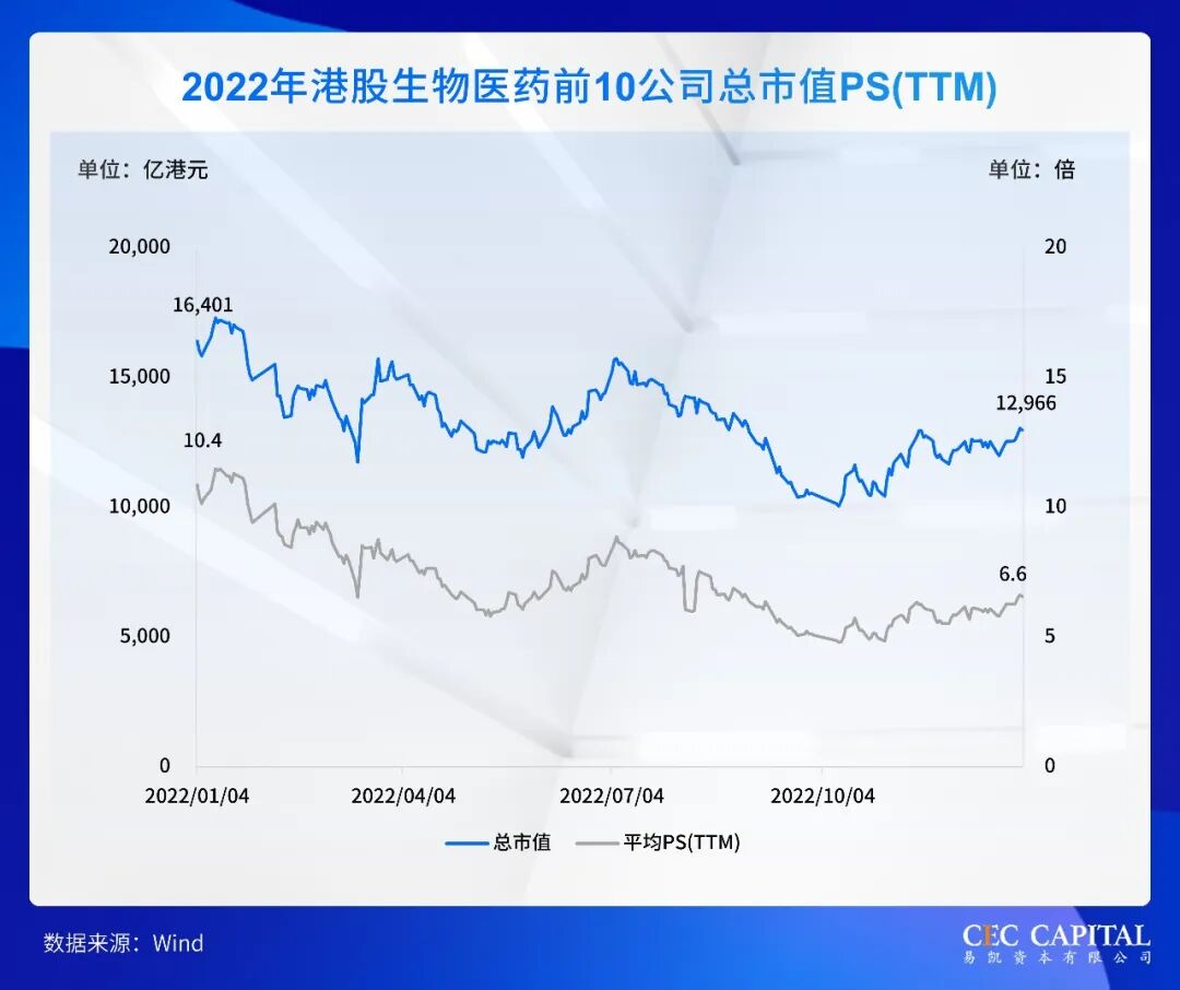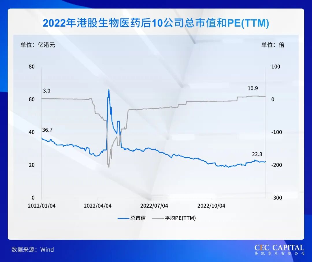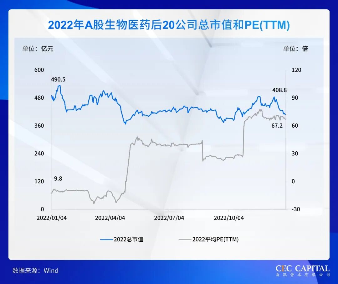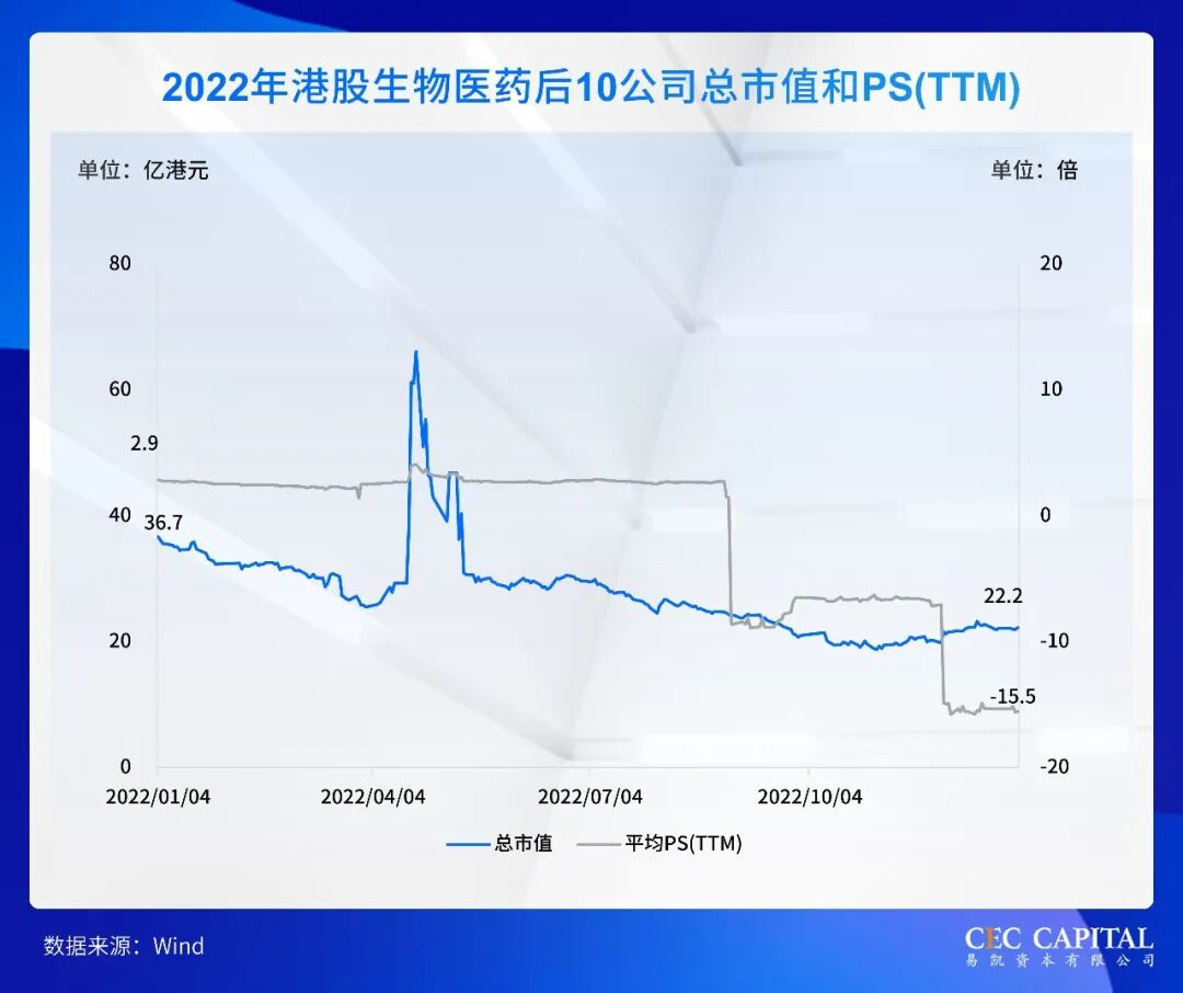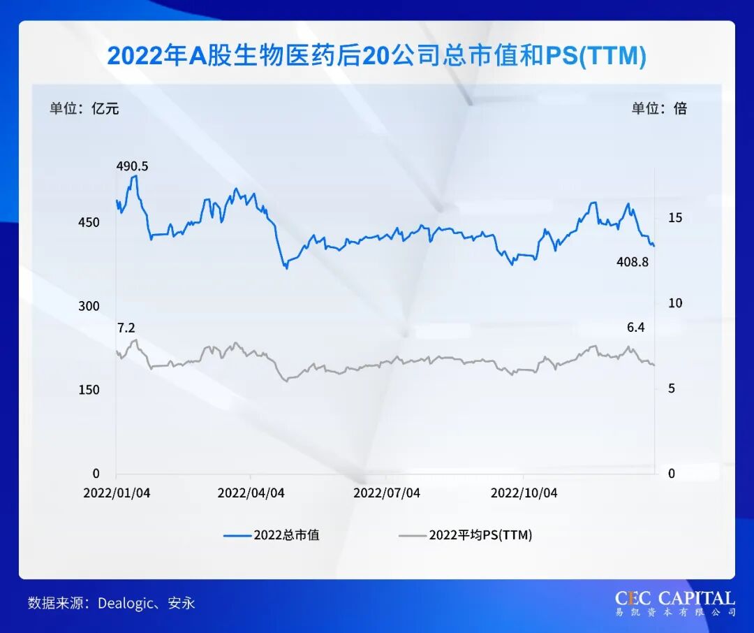 基于前20及后20名的公司2022年市值及PE(TTM)、PS(TTM)的变化可以看到:A股前20名的企业整体维持跌势,与医药板块整体走势相似,也是A股整体市值及盈利能力降低的缩影。后20名因普遍出现亏损情况,2022年整个一季度和二季度部分时间PE(TTM)为负且出现较大幅度的涨跌。但相比前20名,市值表现相对较好,并未出现较大跌幅,维持在360亿以上的水平。这个数值相比于一级市场的企业估值,仍有一定利差空间,也符合医药企业将A股作为首选上市地的情况。