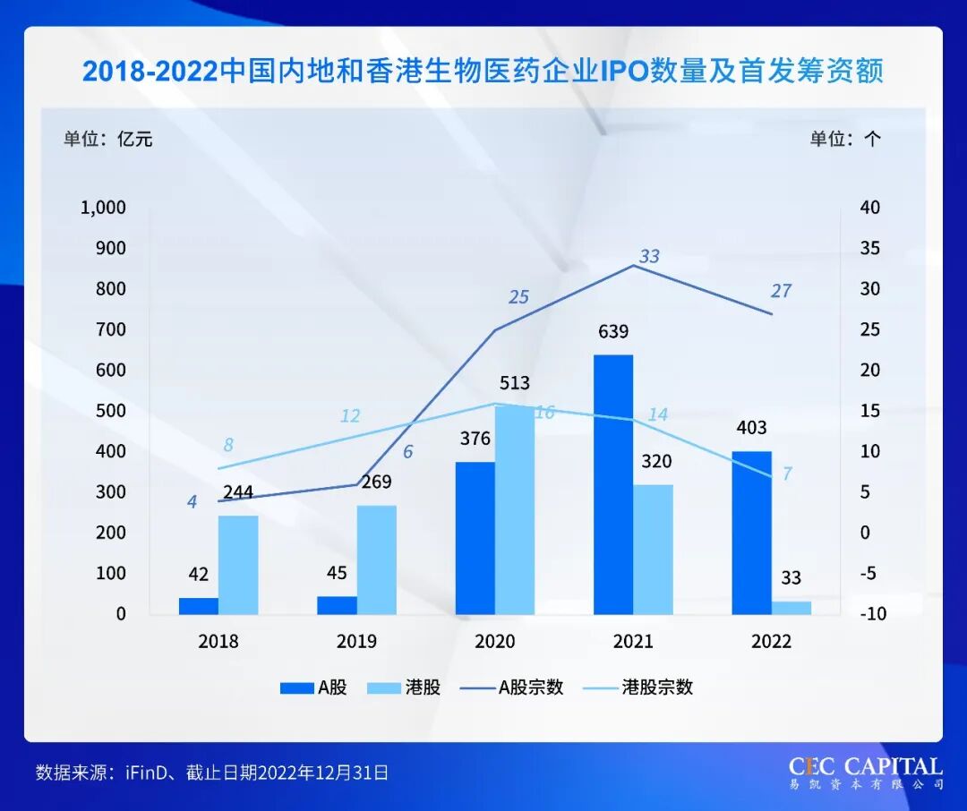 相较于2021年,2022年医药企业上市活动明显放缓。生物医药/医疗保健类企业上市数量和首发筹资额在A股/港股中均排名前列,生物医药企业A股IPO比例逐年增高。自2021年后,A股上市企业数量及首发筹资额开始超越港股。