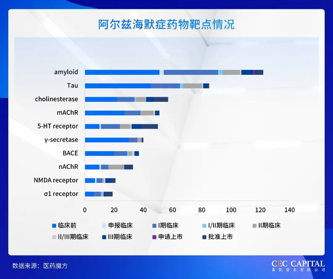 AD发病机制目前仍在探索中,但Aβ (β-amyloid peptides) 作为AD发病过程中的核心因子位列第一,目前Aβ、Tau、ACHE、NMDAR是研发最为热门的四个靶点且已有药物获批上市,但仍需要能够治愈的药物出现,各大药企纷纷向AD发起挑战,但大部分无疾而终,直到百健的Aducanumab单抗获批,才让全球药企和资本再拾信心。