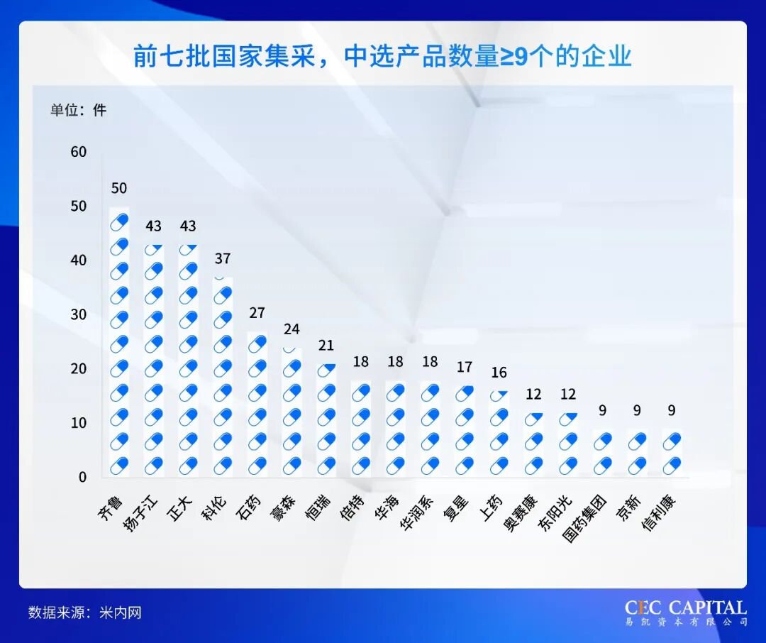 集采中选企业正不断向头部集中。截至2022年底,前七批国家集采中选品种数最多的依次是齐鲁(50个)、扬子江(43个)、正大系(43个)、科伦药业(37个)和石药集团(27个),中选品种数都在25个以上,其后是豪森和恒瑞,分别中选了24个和21个品种。三家超大型企业华润医药、上海医药和国药集团分别中选了18个、16个和9个药品。2018年,首次国采(4+7)时,合计中选数超过全国1/3的原料药国际化代表浙江华海(中选6个)和浙江京新(中选3个),截至目前,分别累计中选了18个和9个药品。