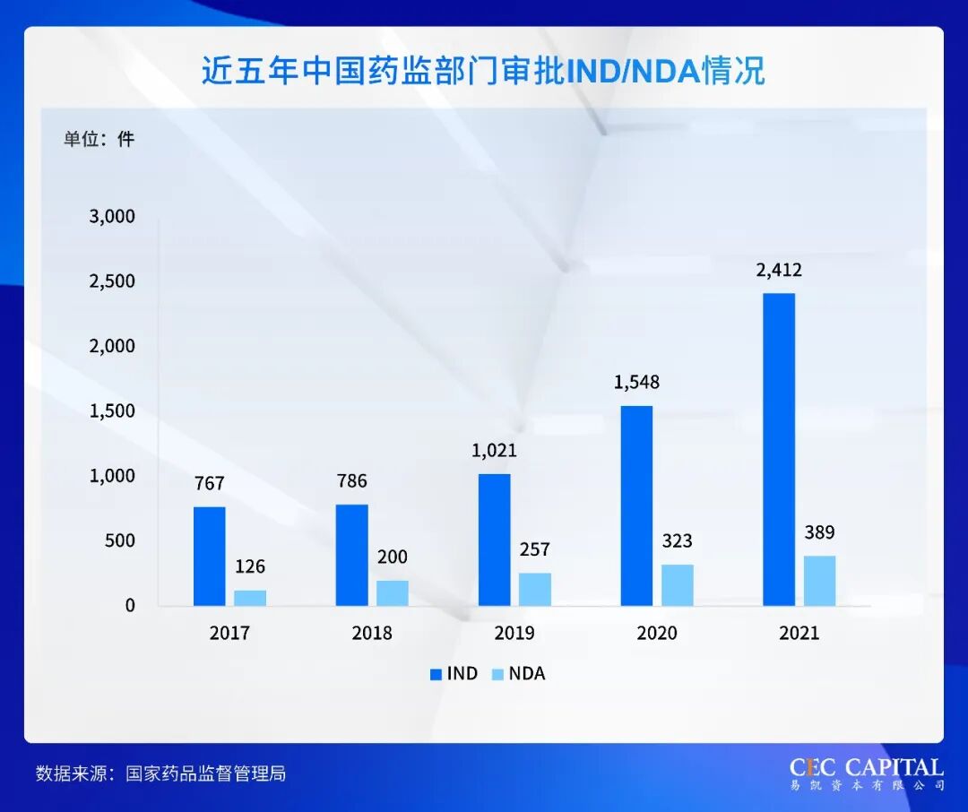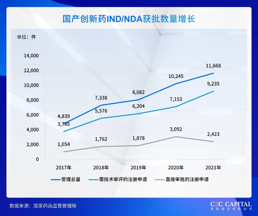 根据国家药监局药品审评中心(CDE)官方数据,2021年CDE受理注册申请总量11658件,是2017年的2.4倍。特别是需技术审评的注册申请,年均增速达到了25%(2022年数据尚未公布)。