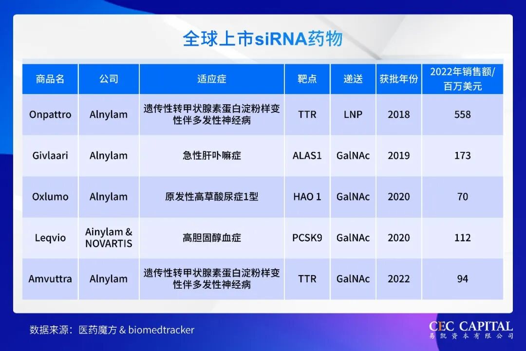 siRNA药物目前已有5款药品上市,其中诺华与Alnylam开发的Inclisiran是一款长效降脂药,2021年12月22日获FDA批准用于治疗成人原发性高胆固醇血症,其创新的小干扰核酸作用机制使患者每年仅需两次皮下注射即可获得降脂疗效,开启了小核酸药物应用于常见慢性病的新篇章,2022年上市第一年全球销售额已达11.2亿美元。多个全球多中心III期临床结果充分证实了Inclisiran可实现强效、长久、平稳地降低LDL-C,在18个月研究期间降幅可达52%,且4年的随访结果进一步表明Inclisiran持久稳定降低LDL-C,平均降幅为44.2%,安全性良好。Inclisiran的上市标志着小核酸药物作为基因治疗正式进入大适应症领域,为整个赛道打开了想象空间。