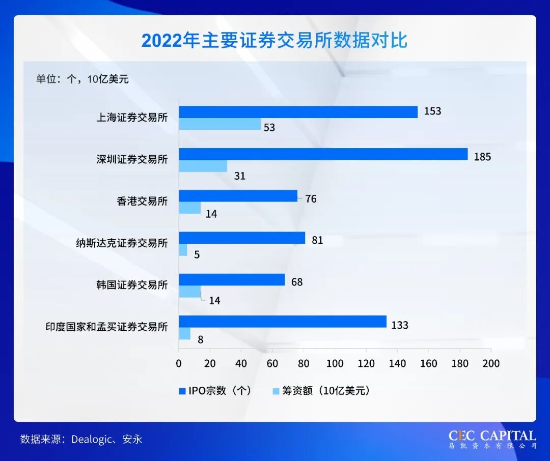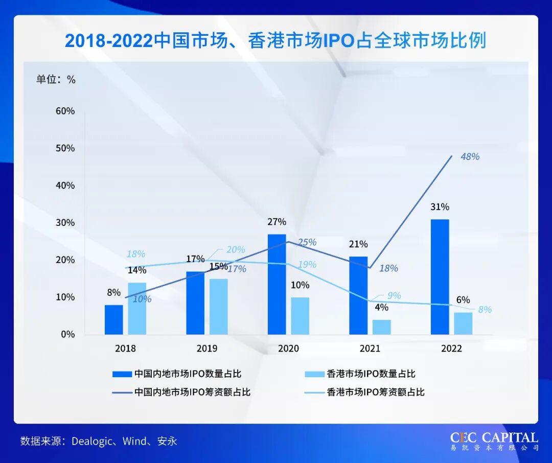 上交所、深交所分列2022年全球交易所IPO数量、筹资额前二,香港交易所数据同样位居世界前列。2020年起,香港市场筹资额占全球市场比例持续下降,由2019年的20%下降至2022年的8%,IPO数量占比方面,2022年较2021年有所提升,但仍未达到疫情前水平;中国内地市场筹资额占比经历2021年的下滑后,在2022年大幅回升,达到全球市场的48%,回归2021年之前的增速。