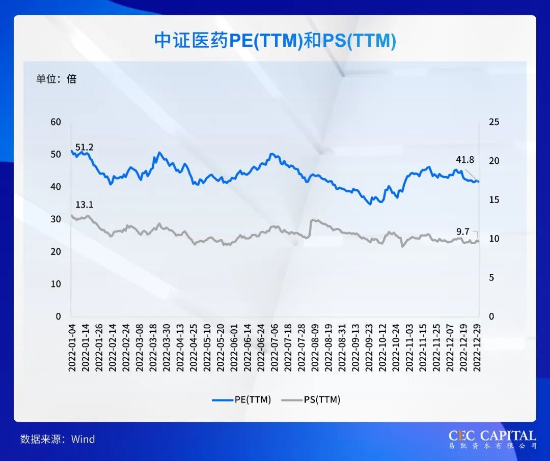 2022年A股生物医药细分领域的市值整体处于下行调整阶段,在3.8万亿和5.5万亿之间波动,市值从人民币5.39万亿元下跌至人民币4.58万亿元,下跌幅度15.03%。PE(TTM)与PS(TTM)整体维持跌势,PE(TTM)从年初的51.23x年底下跌至41.75x,整体下跌18.50%。PS(TTM)在9.0x~13.1x之间波动,从年初的13.05x下降至年底的9.71x。