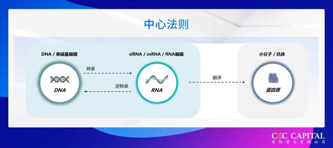 过去30年间,药物研发经历了小分子、抗体药物时代,引领了两次药物研发浪潮,推动了肿瘤、自免及部分慢病治疗的飞跃式发展。小分子和抗体药物作用的核心是蛋白,通过调节蛋白功能达到治疗的目的。目前已知约有5,000多种人体蛋白与疾病相关,其中近1,000种蛋白已成药,另有3,000-4,000种蛋白因结构、作用机制等原因无法通过大小分子调控,因此成为了“不可成药”的靶点。近年,随着基因治疗、干细胞等新药物Modality的出现,实现了对中心法则的上游基础DNA和RNA的调控、甚至功能细胞本身的再生,例如核酸类药物作用于RNA调节蛋白表达,AAV基因治疗、基因编辑疗法作用于DNA调节蛋白表达甚至修改蛋白编码,干细胞分化为功能细胞或组织器官,越来越多的“不可成药”靶点有了新的干预手段,第三次药物研发革命已拉开序幕,推动了单基因疾病、罕见病、眼科、中枢神经等领域疾病的快速发展。