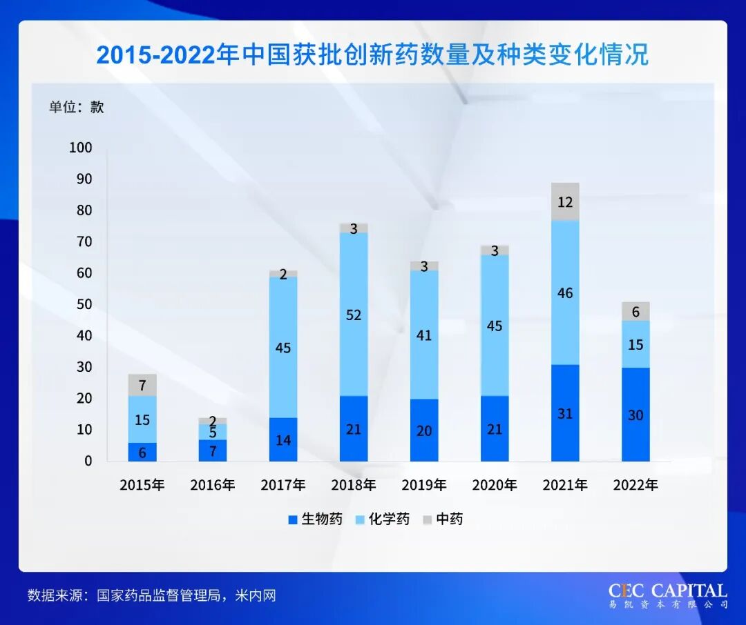 2015-2022年的几年,我国创新药物的政策环境不断优化,与此同时我国对知识产权现状的逐步改善使得创新活力不断释放,逐步打破了国内创新药研发的坚冰局势,加快了我国创新药行业的发展速度。国家药品审评审批制度改革、港股18A和科创板设立等一系列外部利好因素出现,中国医药产业对创新的共识快速形成,资本市场追逐医药创新的热潮很快来到,中国本土创新药市场规模及产品获批情况都快速增长。而且,2018年国家医保局成立以后,医保目录调整常态化、创新药国家谈判机制化,新药从获批到进入医保目录的进程得到了加速,我国创新药市场规模也稳步扩大。