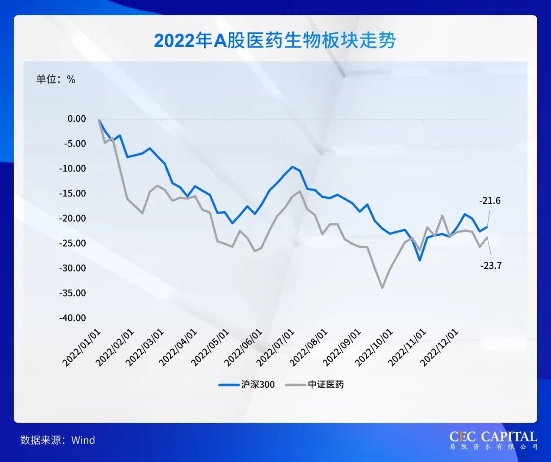 2022年初至今,医药生物板块整体呈现下行趋势,Q4出现回调趋势,全年累计跌幅共23.73%。其中2022年上半年,受疫情严峻、FDA ODAC会议等内外部多重因素影响,市场整体继续下挫、悲观情绪浓厚,医药生物板块持续下跌;6月疫情得到控制后,板块开启底部反弹,疫后复苏预期增强;7月份起板块内化学制剂、生物制品、中药等中报表现受疫情影响明显,叠加中美地缘政治风险对CXO板块的影响,医药板块整体开启下行走势;10月份起受集采政策转向边际温和以及防疫政策调整的影响,中证医药板块整体走势开始回调。