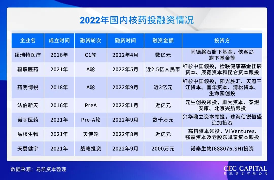 尽管处于萌芽早期,各大玩家已经开始争先涌入,提前占位核药赛道。2022年发生了多起资本市场融资案例,高榕资本、VI Ventures、红杉中国、元生创投等纷纷出手。红杉中国领投了辐联医药、药明博锐两家核药企业的A轮融资,融资金额分别接近2.5亿和3亿元。