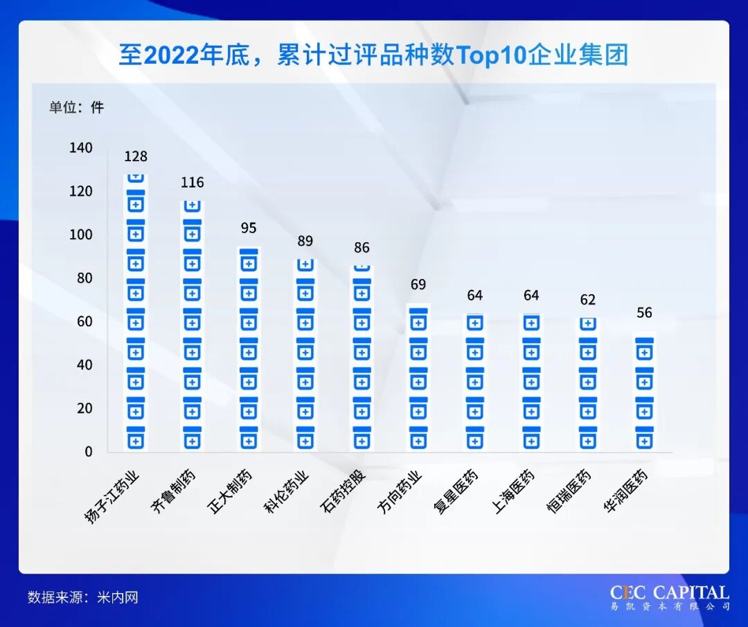 过评最多的前几名也均为头部药企。截至2022年底,累计过评药品数最多的分别是扬子江(128个)、齐鲁(116个)、正大系(95个)、科伦药业(89个)和石药集团(86个),这5家也是前七批国采累计中选产品数Top5企业。集采中选和品种过评数正在不断向少数大型企业聚焦。这也践行了2019年11月发布的《关于以药品集中采购和使用为突破口进一步深化医药卫生体制改革的若干政策措施》提出的“加快形成以大型骨干企业为主体、中小型企业为补充的药品生产、流通格局”的要求。超大型企业上海医药和华润医药累计过评数分别为64个和56个。