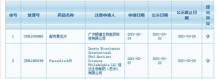 3月22日,国家药品监督管理局药品审评中心(CDE)官网最新公示,信达生物制药(苏州)有限公司(信达)的Parsaclisib片以及广州顺健生物医药科技有限公司(亚盛医药全资子公司)的耐克替尼片已纳入拟突破性治疗品种。