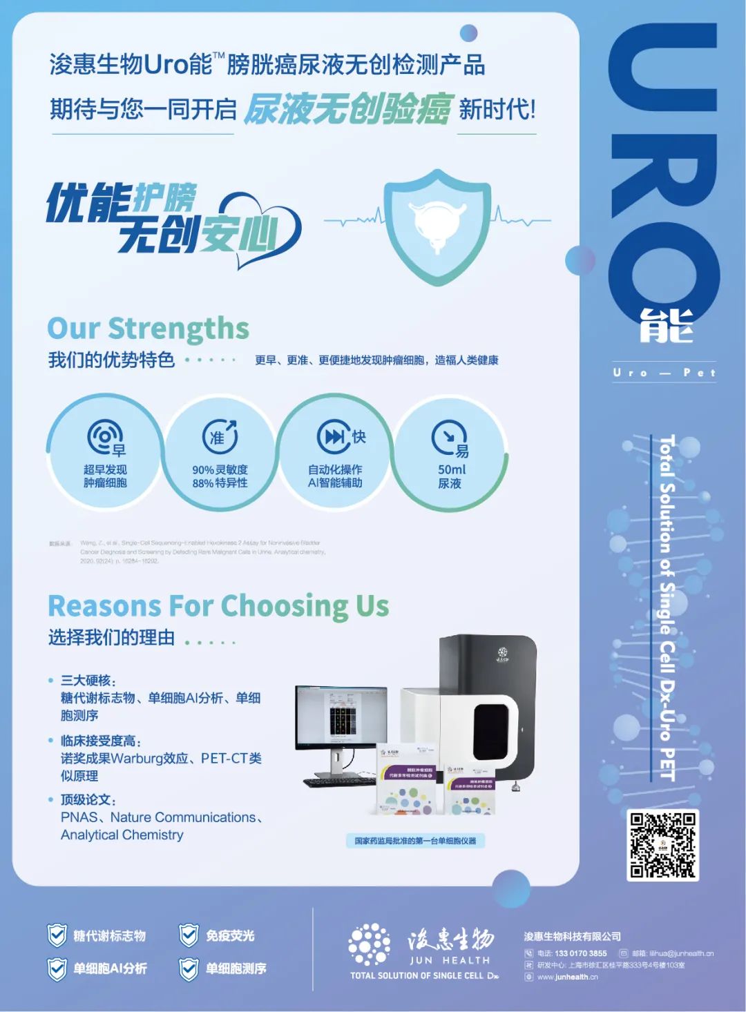 Uro能™是浚惠生物基于全球领先的单细胞诊断C-PET平台研发的创新产品,通过“糖代谢标记物+单细胞测序”组合技术实现尿液无创检测尿路上皮肿瘤,已获药监局批准上市,灵敏度和特异性接近90%,性能全球领先,获得《2020年工博会》高校组最高奖-特等奖,登台《2019克利夫兰医学创新峰会》、《2020国际液体活检大会》等世界顶级大会介绍产品。