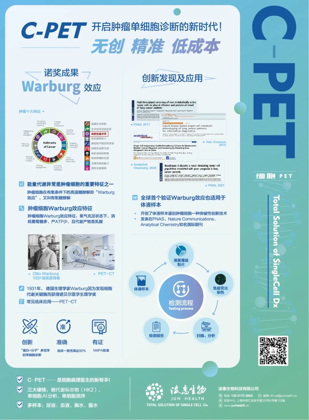 浚惠生物是一家研发“单细胞液体活检”分子诊断产品和服务的创新型企业。公司在全球首个验证了肿瘤细胞能量异常代谢的Warburg 效应用于体液样本的可行性,开创了体液样本鉴别肿瘤细胞的一种创新方法。今天,浚惠生物搭建了全球领先的 “蛋白+分子”单细胞诊断C-PET平台,包括适用于多癌种、多样本的临床应用级单细胞液体活检检测试剂和仪器,覆盖筛查、早诊、治疗全过程,引领全球创新。浚惠生物以更早、更准、更便捷地发现早期发生或转移的肿瘤细胞为使命,造福人类健康。