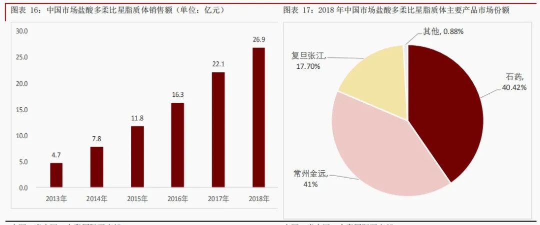 盐酸多柔比星主要用于多发性骨髓瘤、淋巴瘤、卵巢癌、乳腺癌的化疗。目前,盐酸多柔比星脂质体注射液在国内共有 3 家仿制药企业获批,分别是石药集团、常州金远药业和复旦张江。