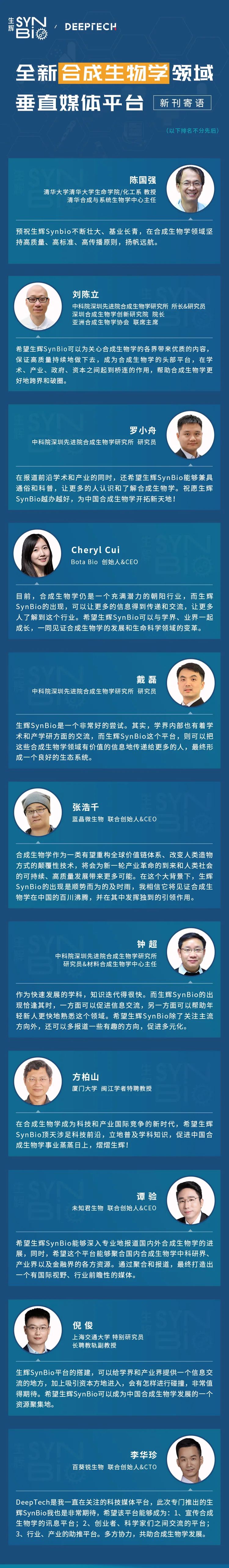 新刊初创,荣幸之至,生辉 SynBio 获得了数位国内合成生物学领域先行者们的建议和寄语。来自学界和业界的期待,也是生辉 SynBio 未来努力的目标(以下排名不分先后):