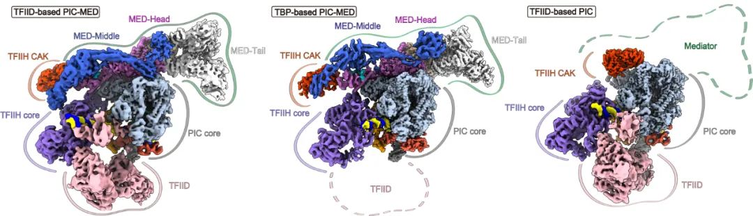 图1: 本项研究基于TFIID的PIC-Mediator复合物,为完整转录起始复合物PIC-Mediator(左),中间为何源组近期发表的基于TBP的PIC-Mediator【1】,右侧为徐彦辉组近期发表的基于TFIID的PIC