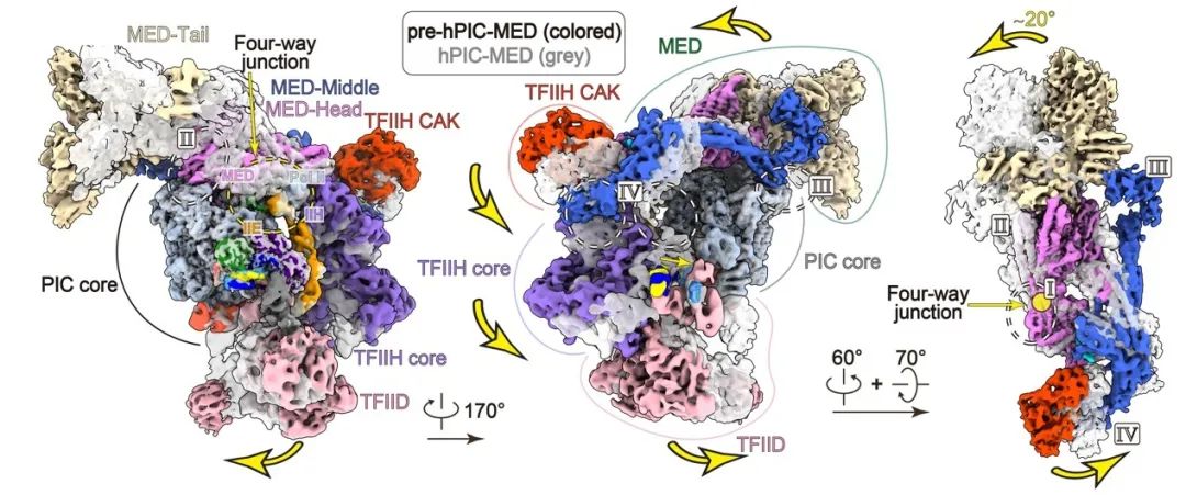 两种PIC-Mediator复合物的结构比对,彩色展示PIC-Mediator初态(pre-hPIC-MED),灰色展示PIC-Mediator终态(hPIC-MED)。