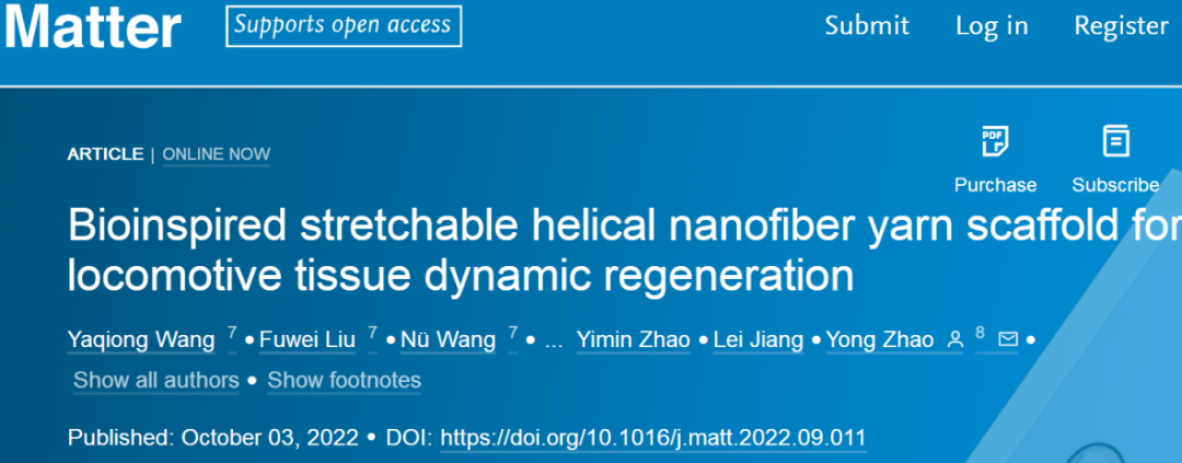 1.Wang, Y., Liu, F., Wang, N., Yue, G., Wang, X., Cai, B., ... & Zhao, Y. (2022). Bioinspired stretchable helical nanofiber yarn scaffold for locomotive tissue dynamic regeneration. Matter.
