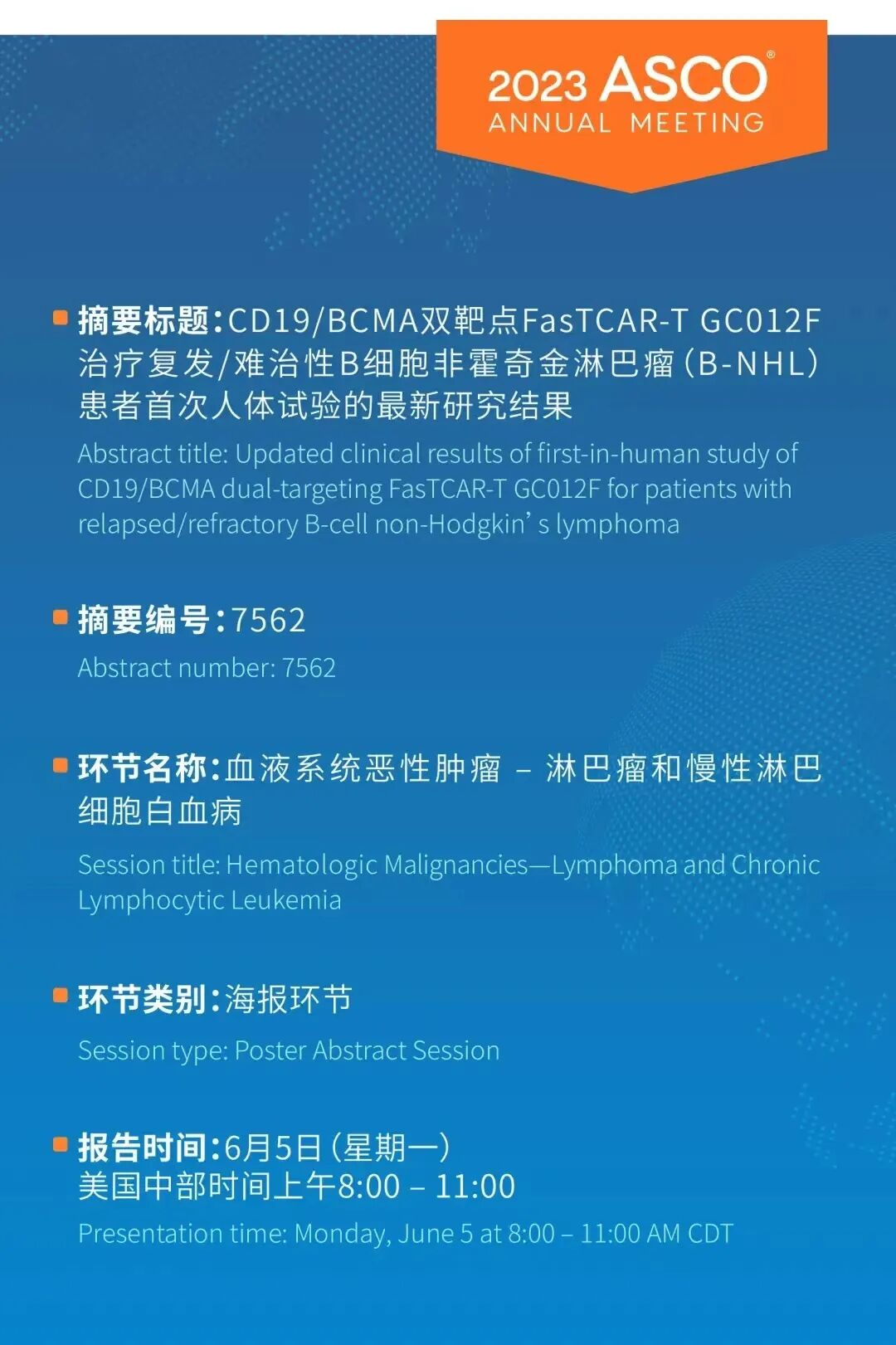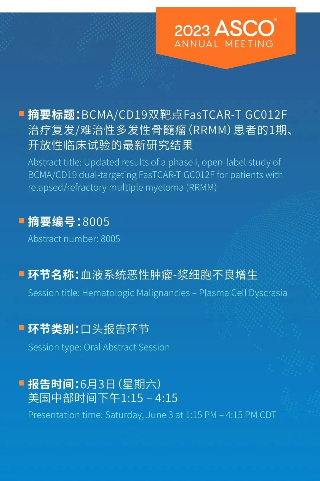 “一年一度的ASCO年会近在眼前,非常期待与业界分享GC012F在治疗RRMM和B-NHL两项临床研究中取得的最新临床数据。其中,GC012F治疗RRMM的长期随访数据得到大会认可入选口头报告,对此我们感到欣喜。目前,这两种血液肿瘤仍然亟待更多变革性的治疗手段,从而为患者带来更安全、高效且快速可及的临床获益。”亘喜生物首席医学官李文玲博士表示,“2023年对于GC012F以及亘喜而言都是至关重要的一年,随着这款核心候选产品成功完成IND中美双报,我们正在推动IND临床试验如期启动。借助ASCO年会的舞台,我们希望能向癌症领域的同仁展示最新的临床数据,进一步为FasTCAR平台在广泛适应症中的应用前景提供强有力的佐证,并彰显双靶点CAR设计的有效性以及FasTCAR平台在提升药物惠及患者速度、强化产品细胞质量方面的潜在优势。”