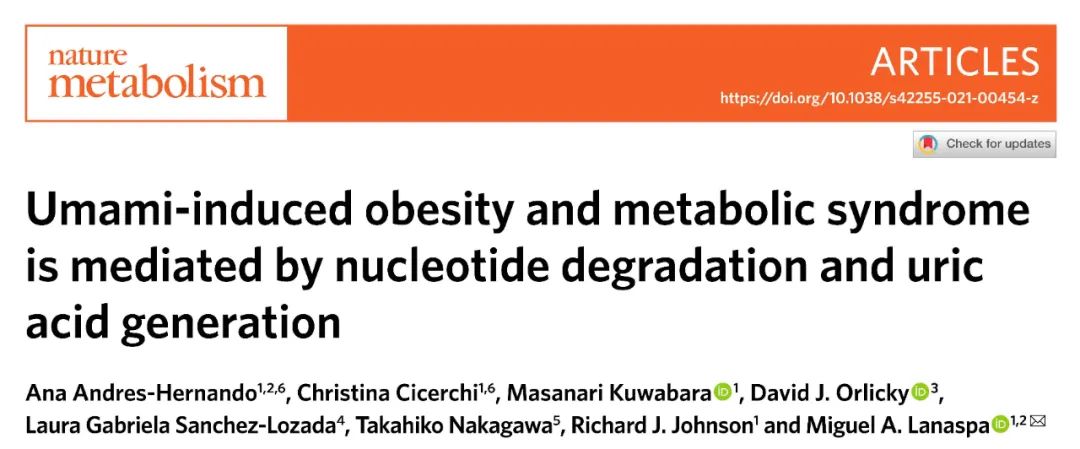 Andres-Hernando A, Cicerchi C, Kuwabara M, et al. Umami-induced obesity and metabolic syndrome is mediated by nucleotide degradation and uric acid generation[J]. Nature Metabolism, 2021, 3(9): 1189-1201.