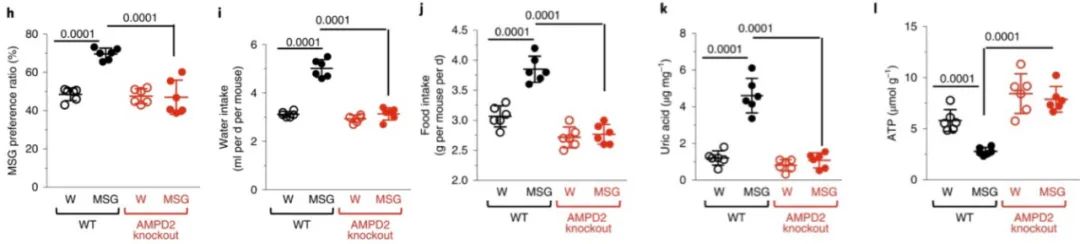 AMPD2敲除鼠的MSG偏好、食水摄入、体内尿酸水平、ATP与野生鼠有明显差异