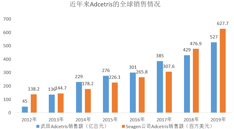 据武田和Seagen历年财报,自上市后,Adcetris全球销售额一直保持稳步增长,2019年的全球销售额高达11.21亿美元。