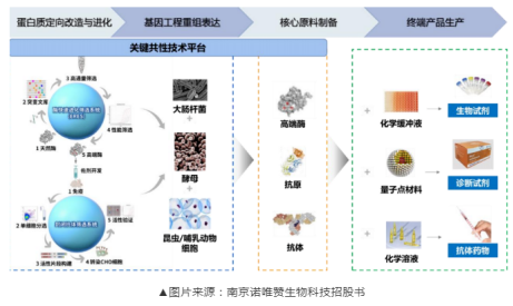 诺唯赞是一家围绕酶、抗原、抗体等功能性蛋白及高分子有机材料进行技术研发和产品开发的生物科技企业,依托于自主建立的关键共性,先后进入了生物试剂、体外诊断业务领域,并正在进行抗体药物的研发,是国内少数同时具有自主可控上游技术开发能力和终端产品生产能力的研发创新型企业。