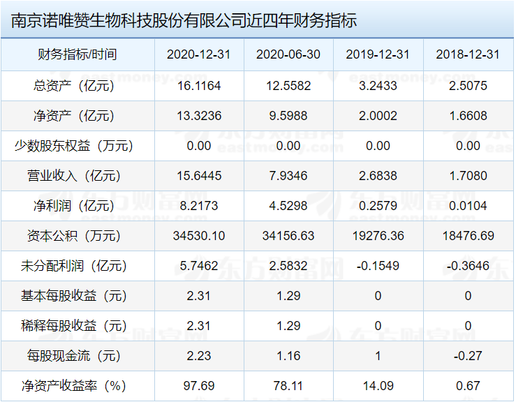 2018-2020年,诺唯赞总额分别为1.12亿元、1.71亿元、2.69亿元及15.6亿元,实现归属于母公司股东的分别为364.46万元、103.87万元、2579.48万元及8.22亿元。