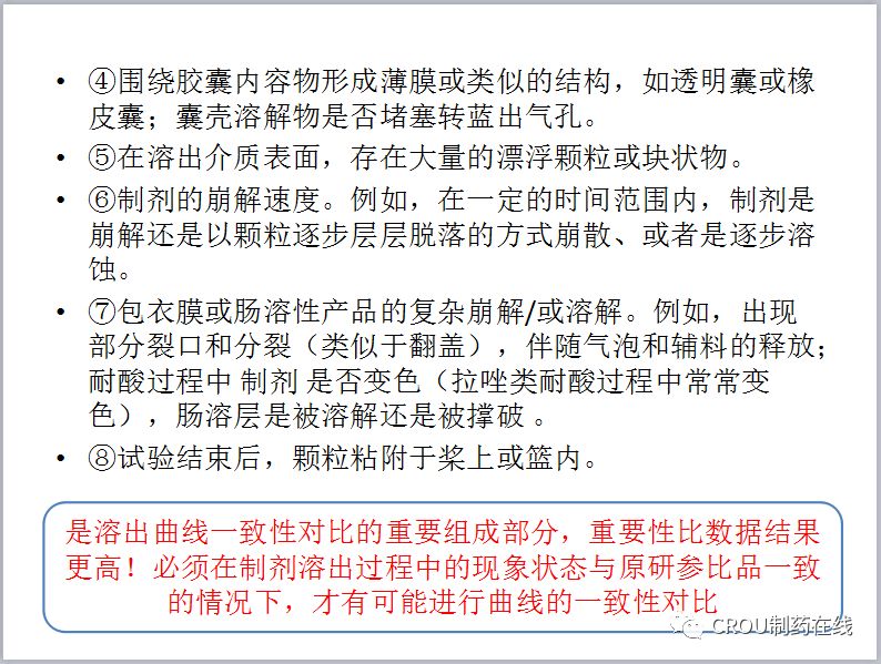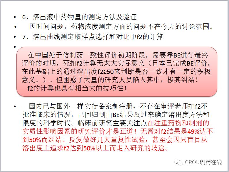 最后的取样点:并不一定是f2计算时的最后点,是达到平台期后应完全溶出的点(95%以上);如是难溶性药物,还要延长取样时间,以考察溶解后的药物是否会再析出。