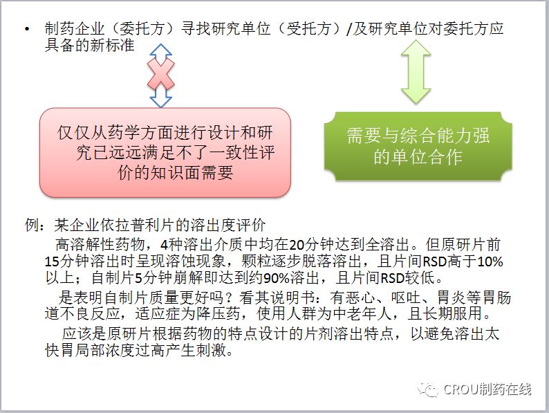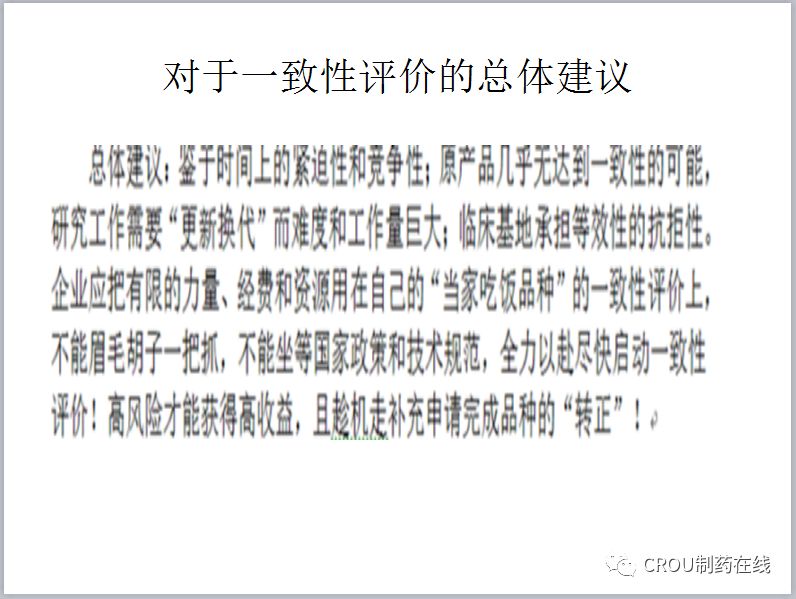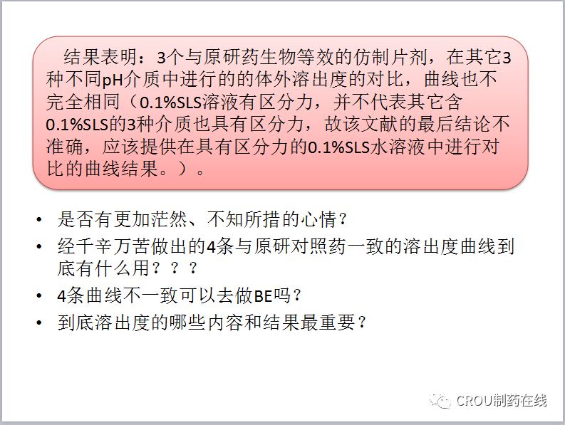 研究的总体评估:仅从溶出度单方面进行了溶出曲线的一致性评价,没有联系处方工艺和临床效果进行关联性思考。虽然BE等效的可能性很大,但临床效果方面可能会出现差异,影响市场的销售!
