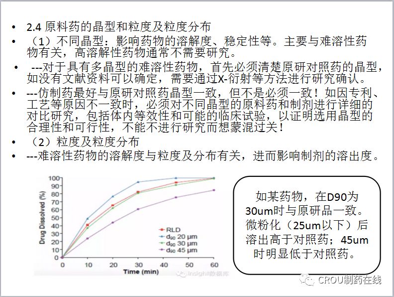 研究中根据各自剂型的特点,至少需要对布洛芬的晶型、粒度及粒度分布、混悬液的沉降情况、溶出度、有关物质、含量等关键理化性质进行全面对比研究。