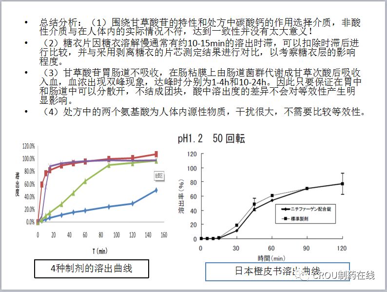 原因:甘草酸苷遇酸发粘,需要处方中加入碳酸钙在胃酸中反应产气使其崩散;而在其它无酸的介质中不会发粘,溶解度高,很快溶出,没有区分力。
