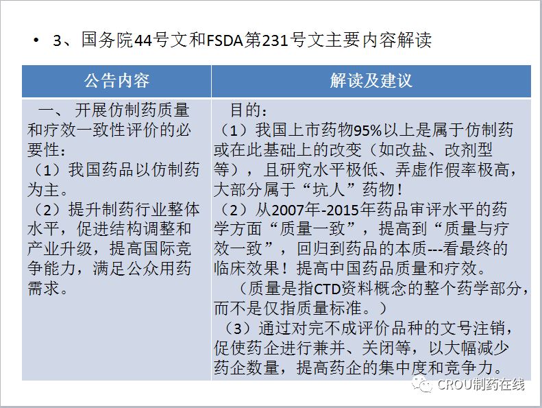 3、《国务院关于改革药品医疗器械审评审批制度的意见》44号文和FSDA《关于开展仿制药质量和疗效一致性评价的意见(征求意见稿)》第231号文主要内容解读