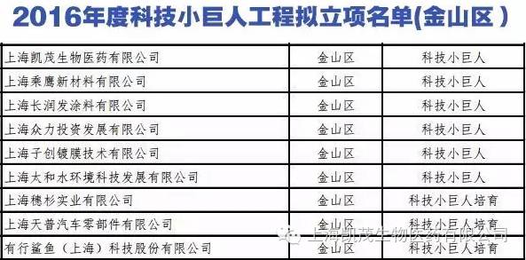 日前,经公开自主申报、专家评审,上海市2016年度科技小巨人工程拟立项项目拟定,并对项目名单予以公示。金山区共有9家企业入围,其中上海凯茂生物医药有限公司等6家企业入围上海市科技小巨人企业立项公示名单。