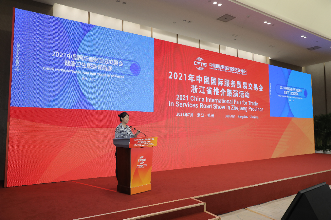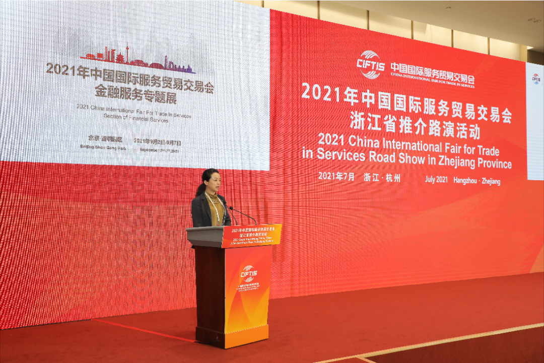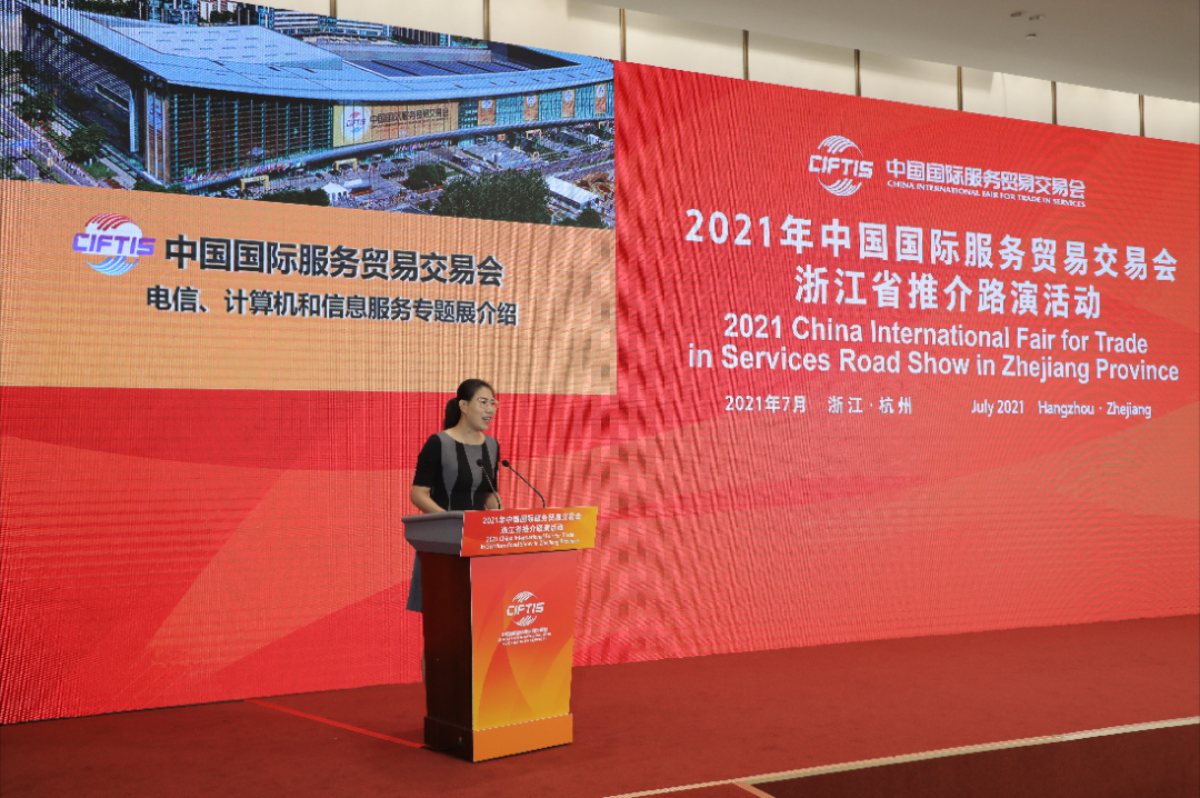 7月20日上午,2021年中国国际服务贸易交易会(简称“服贸会”)浙江省推介路演活动在杭州国际博览中心举行。活动主要面向浙江省商协会和企业代表,重点介绍了2021年服贸会整体情况、浙江省作为2021年服贸会主宾省总体情况,同时对服贸会电信、计算机和信息服务、金融服务、健康卫生服务三个专题进行了重点推介。
