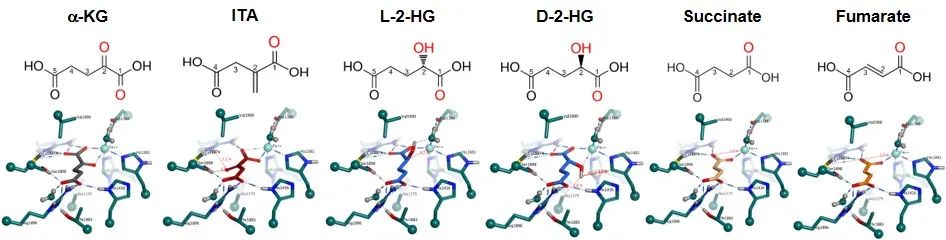 α-KG被报道与TET2蛋白催化中心H1416、R1896和S1898形成氢键和离子键,并且通过其C-1羧基和C-2酮基与Fe(II)以双齿方式结合【8】。与α-KG类似,ITA也是含五个碳原子的二羧酸,尽管拥有C-1位羧基,但其C-2位上的酮基结构被烯烃所替代和无法与Fe(II) 以双齿方式结合,预示着ITA有可能与α-KG竞争结合TET2蛋白催化中心