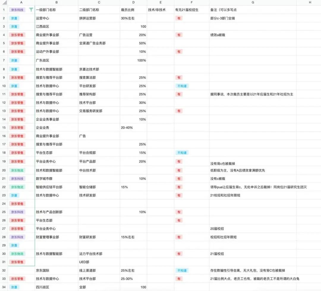 据网传的一份文档显示,京喜、京东国际、京东零售、京东物流、京东科技等多个板块的多个事业部都设置了裁员比例,主要在10%-30之间。