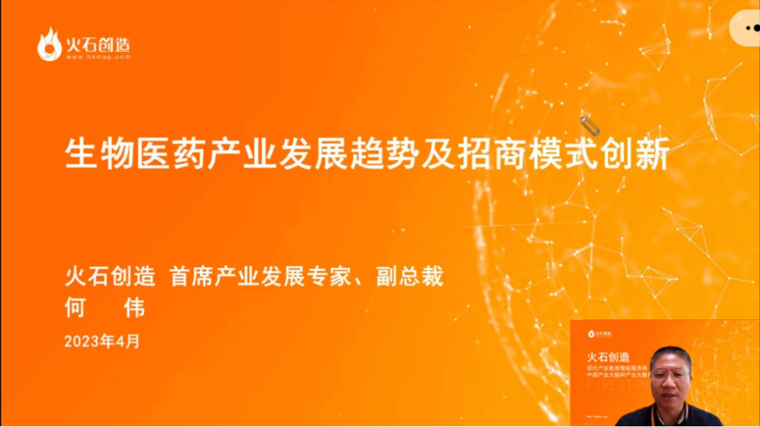 4月12日,受商务部培训中心(商务部国际商务官员研修学院)邀请,火石创造副总裁、首席产业发展专家何伟为全国百余家政府单位代表线上授课。本次授课的主题为“生物医药产业发展趋势及招商模式创新”。