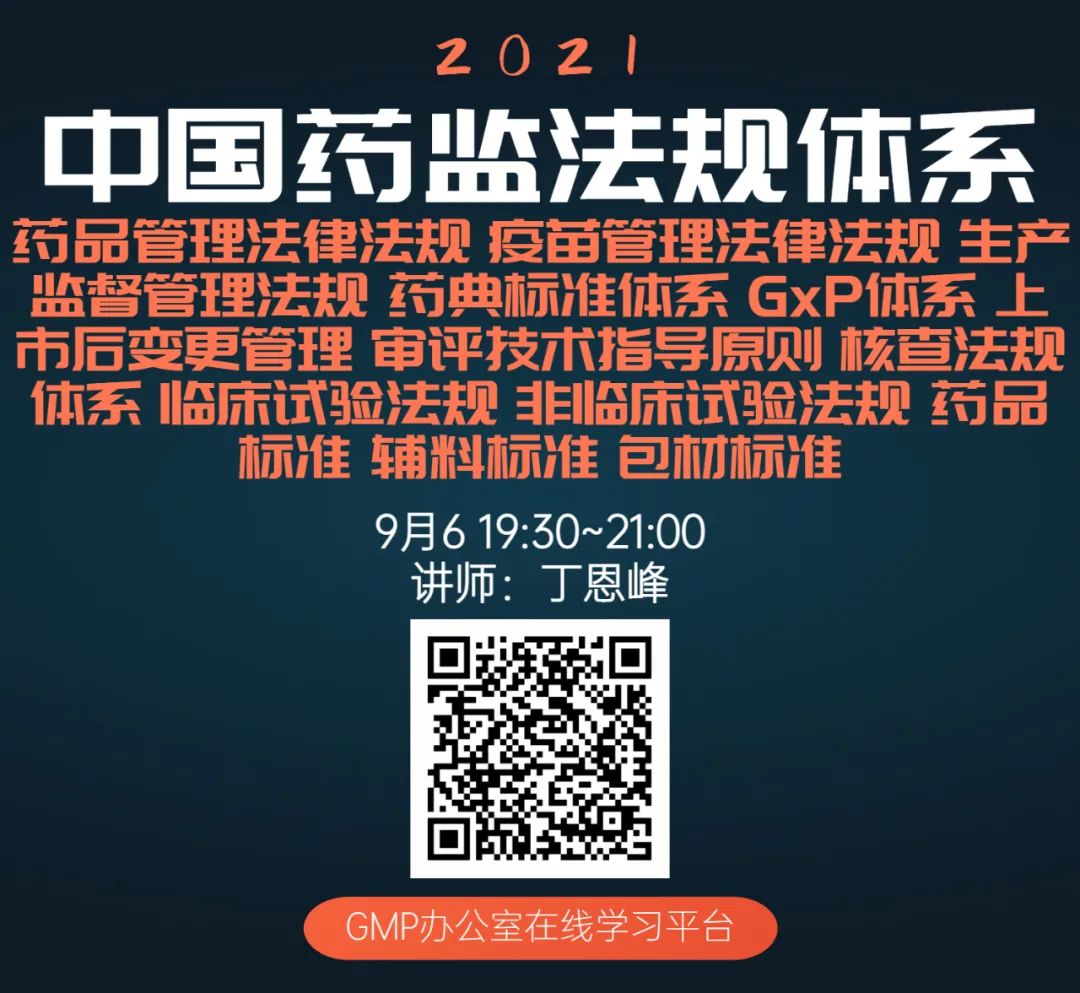 以下为《中国药监法规体系:药品管理法律法规、标准体系、上市后变更管理、审评指导原则、核查法规、临床/非临床法规!》直播培训课程,直播将于今晚19:30开始!扫描图中二维码可进入。