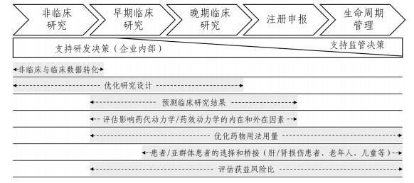 建模与模拟技术在药物研发生命周期中的应用示意图