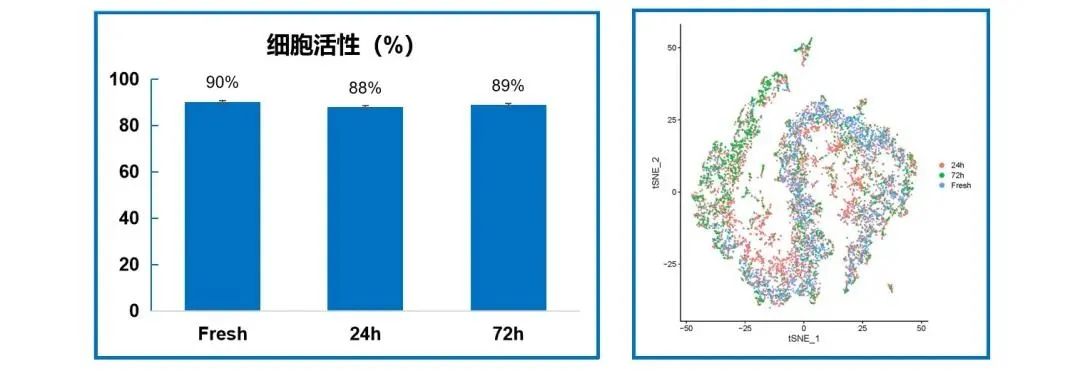 单细胞测序实验通常需要收集到新鲜样本后即刻进行,以保证细胞活性和后继RNA扩增的有效性。但针对多数临床样本或多中心取样时,如此严苛的要求往往难以得到满足。新格元组织保存液通过模拟细胞生理环境以维持细胞活性,在2-8℃下,新鲜组织可保存72小时且仍然保持细胞活性及组织内不同细胞的组成。这一创新技术可以使组织样本在收集后于保存液中暂存或寄送至异地实验室进行处理和建库测序,推进单细胞技术的临床应用。