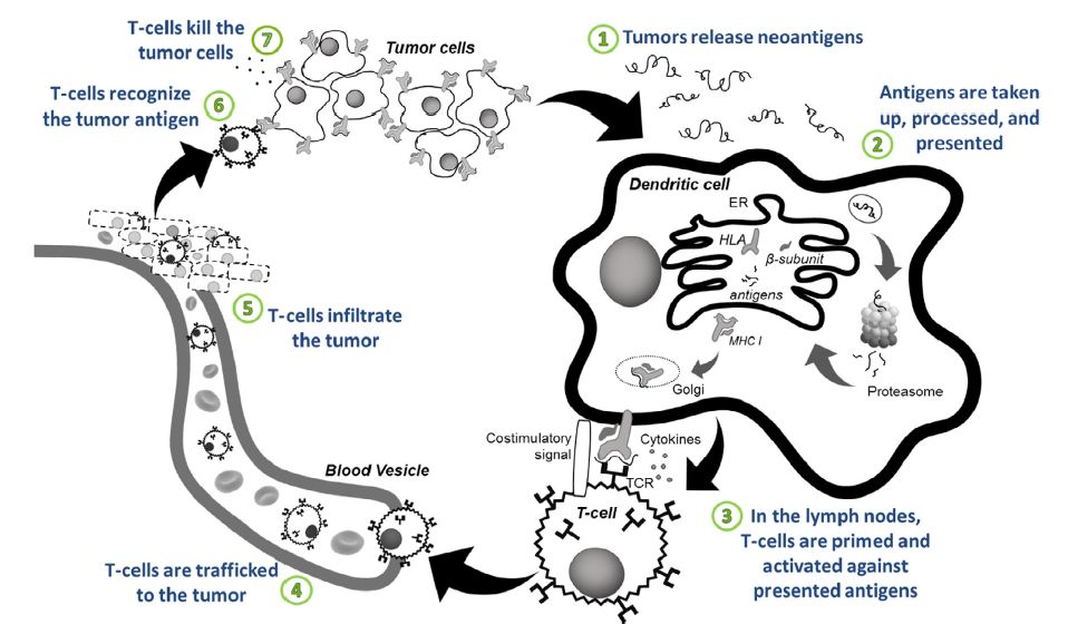 个体化癌症疫苗的开发是基于人体对癌症抗原的免疫反应。癌症患者的肿瘤细胞因为发生基因突变,在细胞中表达了在健康组织中不存在的新抗原(neoantigen)。这些新抗原可以激发人体免疫系统的免疫反应,例如激活T细胞并促进它们的增殖。激活后的T细胞可以迁移到肿瘤附近,对它们进行攻击。然而大多数情况下,肿瘤中表达的新抗原水平较低,不足以激发强有力的免疫反应。