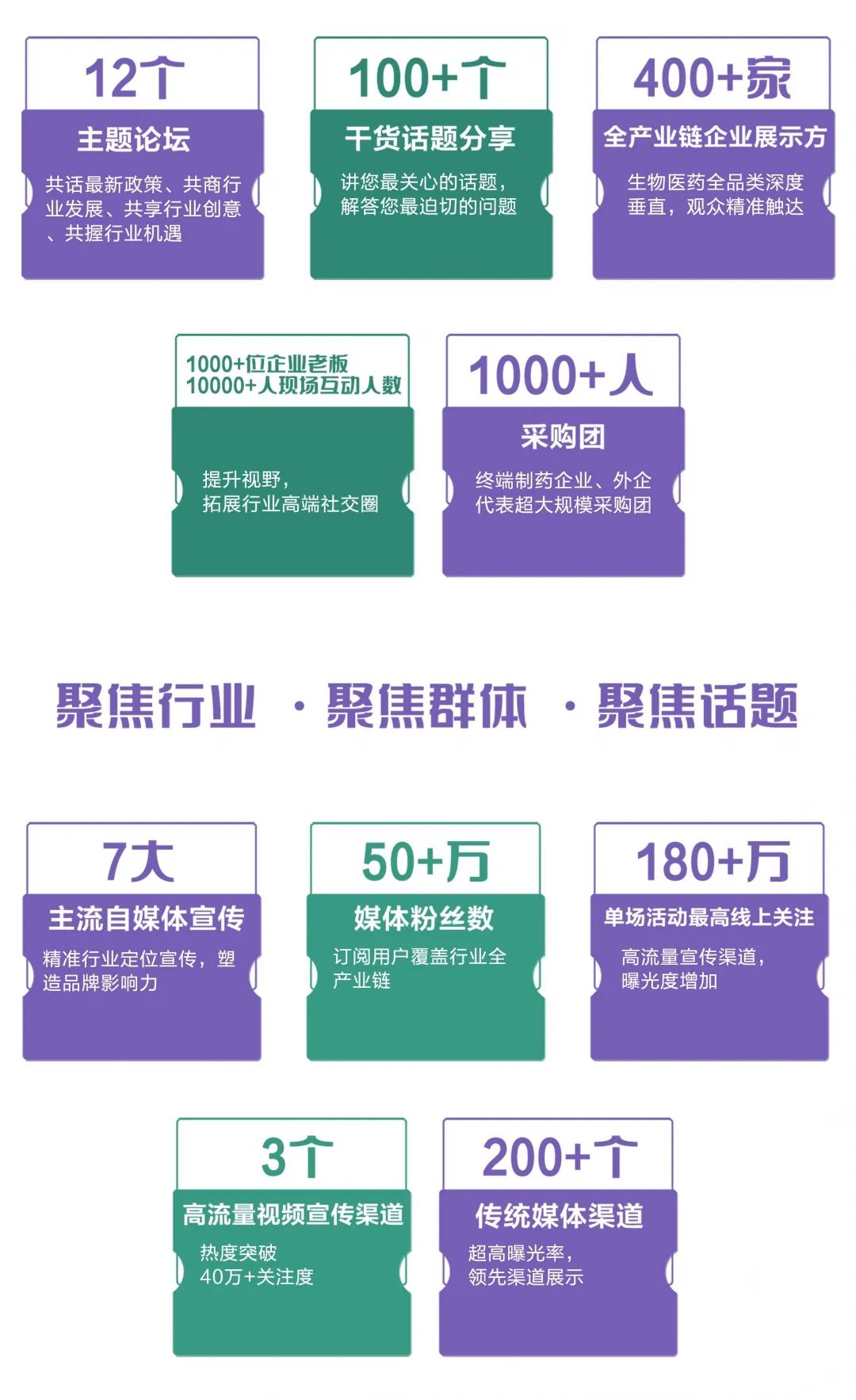 可为生物药/化学药相关新药/仿制药药学研发机构CRO/CDMO、临床用药生产基地、CMO/MAH生产承接企业、临床试验机构、第三方稽查机构、制药装备企业、辅料生产/代理机构、注册咨询机构、海外药品研发机构、临床试验机构、杂质对照品、参比制剂、第三方检测机构、实验室工程、实验室设备、分析设备、生产设备、知识产权等企业提供多形式的宣传展示。