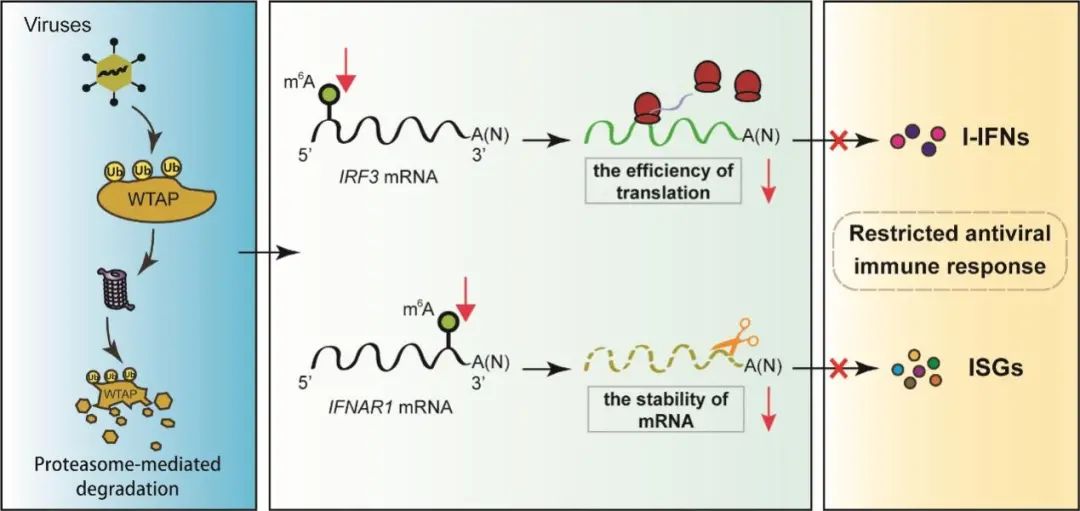 图1. 病毒感染后蛋白酶体介导WTAP的降解降低了IRF3和IFNAR1的m6A修饰以及随后的蛋白输出,从而抑制了IFN-I介导的抗病毒免疫反应。