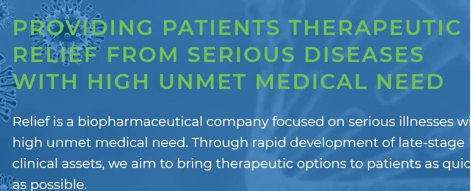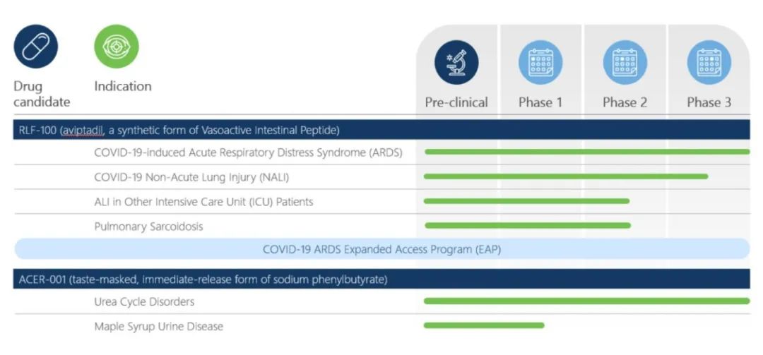 Relief主要关注分子的临床阶段计划,这些分子具有临床试验史或者具有研究假设支持。Relief的主要候选药物RLF-100TM(aviptadil),一种血管活性肠肽(VIP)的合成形式,正在美国进行后期临床试验,用于治疗由COVUD-19引起的呼吸衰竭。2021年3月,Relief与AcerTherapeutics就Acer-001在全球范围内的开发和商业化签订了合作和许可协议。Acer-001是一种立即释放的苯丁酸钠(NaPB)专利粉末制剂,用于治疗尿素循环紊乱和枫糖尿症。此外,Relief最近完成了对APRApplied Pharma Research SA和AdVitaLifescience GmbH的收购,以开拓市场和开发阶段项目的多样化渠道。