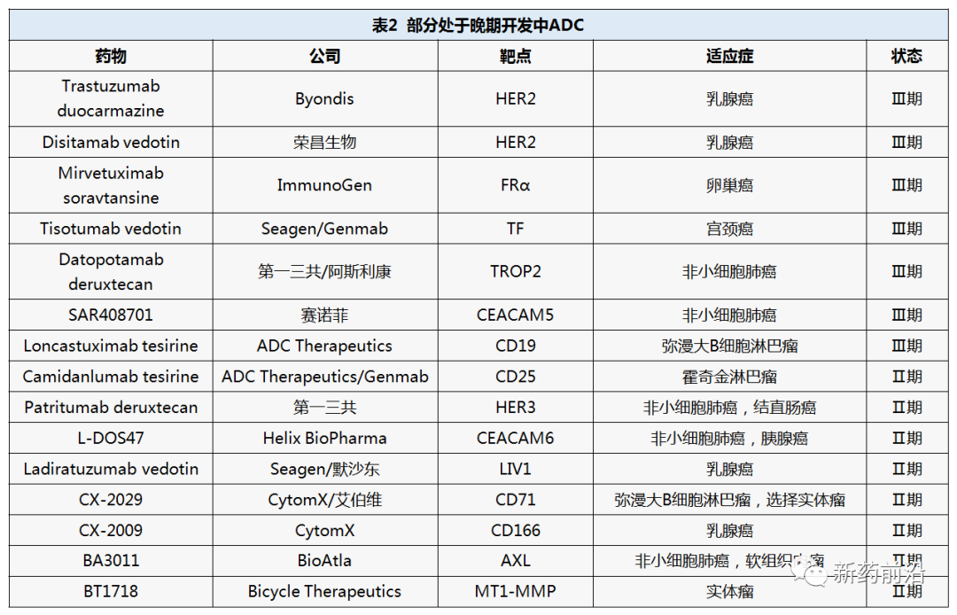 目前,针对现有和新型靶点的大量ADC正在临床开发中(表2)。