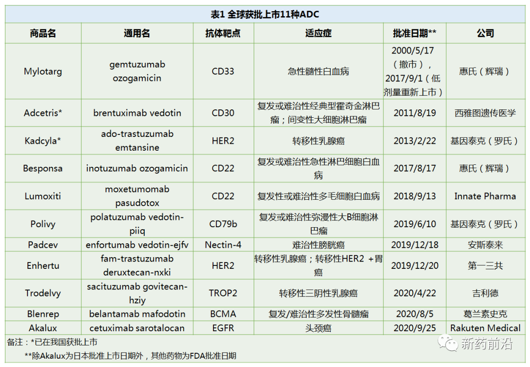 近年来,ADC在肿瘤学领域的地位越来越重要。目前全球有11种ADC获批准上市用于治疗血液学和实体瘤等恶性肿瘤,其中10种获得FDA批准,Rakuten Medical的Akalux(cetuximab sarotalocan)于2020年9月25日获日本PMDA批准用于治疗头颈癌,尚未获FDA批准(表1)。