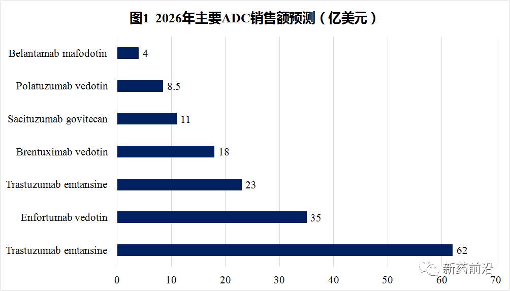 预计到2026年,ADC的全球销售额将超过164亿美元。届时,Trastuzumab deruxtecan将在2026年获得62亿美元的全球销售额,成为全球最畅销的ADC,主要是因为该药可用于乳腺癌的多个亚型(HER2+,HR +/HER2-和三阴性),而且治疗时间长。相比之下,Trastuzumab emtansine仅限于HER2+乳腺癌,预计2026年的销售额为23亿美元,并从2025年开始在美国受生物类似药进入市场的侵蚀。Enfortumab vedotin已获批准用于先前治疗的转移性尿路上皮癌,预计将在疾病进程的早期阶段获得更多的治疗患者,这将推动其全球销售额在2026年达到35亿美元。Sacituzumab govitecan可用于乳腺癌和尿路上皮癌,2026年销售额预计为11亿美元。Cetuximab sarotalocan的销售将受到对头颈部癌病灶的照射需求的限制。