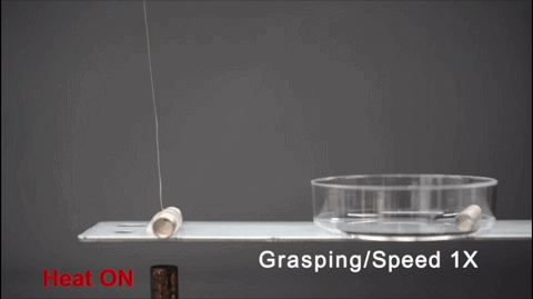 该论文第一个展示的机器人样机是一个微型抓取器,它的长度不到 2cm,宽度是 1.5cm,厚度约为 200μm,它可以轻松抓取并传送一个加热过的金属弹簧。也就是说它不仅体积小,并且具备物体抓取和释放能力。
