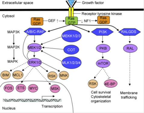 MAPK信号通路经由RAS-RAF-MEK-ERK传递至胞内的多个靶点。ERK激酶是MEK激酶的唯一下游靶点,靶向于ERK靶点的抑制剂能够有效阻断RAS-RAF-MEK-ERK信号通路,同时能够有效逆转由上游BRAF、MEK突变而导致的耐药。这些证据预示着ERK激酶抑制剂在抗肿瘤治疗领域的潜在优势,或许,靶向于ERK靶点的抑制剂有望克服上游激酶靶点的治疗瓶颈、成为新一代的高效抗癌药物。