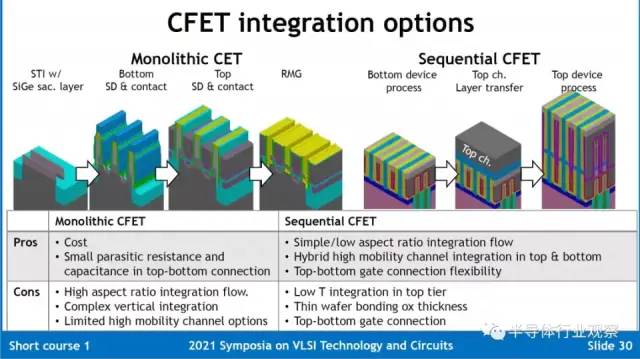 CFET 选项包括单片集成(monolithic integration),其中的 nFET 和 pFET 器件都制造在同一晶圆上。此外还有顺序集成(equential integration),其中的 nFET 和 pFET 制造在单独的晶圆上,然后结合在一起,这两种选择都有多个挑战仍在研究中。